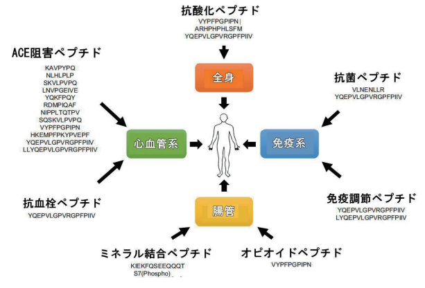 | 図6 –ケフィアに含まれる既知の生理活性ペプチドと、人体のそれらの可能な標的部位。 ペプチド配列は1文字のコードで表示されます。 |