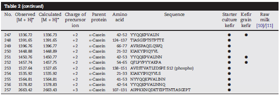 | 表2 –ケフィアのペプチドプロファイル。 シーケンスは1文字のコードで示され、ペプチドの質量はDaで示されています。市販のスターターカルチャーで発酵させた牛乳中の同定されたペプチドとケフィア粒が提示され、生乳のペプチドプロファイルとの一致も表示されます[10、11]。 |