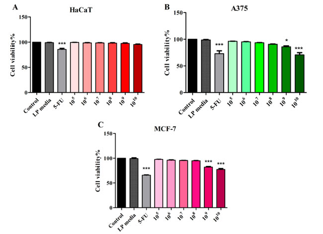 図 1 Lactiplantibacillus plantarum 105~1010 CFU/mL および 5-FU (10 μΜ) で 48 時間処理した後の HaCaT (A)、黒色腫細胞株 (B)、および 乳がん細胞株 (C) 細胞の細胞生存率。 HaCaT:不死化ヒトケラチノサイト、A375:黒色腫細胞株、MCF-7:乳がん細胞株、LP:Lactiplantibacillus plantarum。 結果は、コントロール グループを 100% とした場合の生存率のパーセンテージとして表されます (* p < 0.05、*** p < 0.001)。データは、3 回繰り返して実行された 3 つの独立した実験の平均値 ± SD を表します。 |