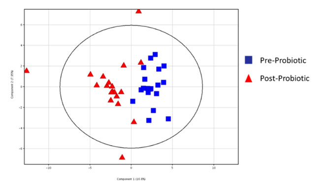 | 被験者の血漿サンプルでは、合計 11,006 個の代謝産物が同定されました。 既知の溶出パターンに基づいて 2,0989 個が特定されました。 2 因子主成分分析の結果を図 2 に示します。合計 114 の化合物が、プロバイオティクス補給前と後の血漿サンプル間で P<0.05 で異なりました。 29人は陽性と特定されたが、85人は不明のままでした。 ボンフェローニ補正を使用した複数のテストの調整後、個々の代謝物は時点間で大幅に異なりませんでした。 |