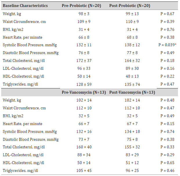 | この研究のために合計 23 人の被験者が募集されました。 2 人の被験者はスクリーニングに失敗し、除外されました。 1人の被験者は研究中に脳卒中を患い、研究のプロバイオティクス部分を完了する前に離脱した。 合計 20 人の被験者がプロバイオティクス介入を完了しました。 20 人の被験者のうち 13 人が、研究の追加のバンコマイシン介入部分に参加することに同意した。 これら 20 人の被験者のベースライン特性を表 1 に示します。 |