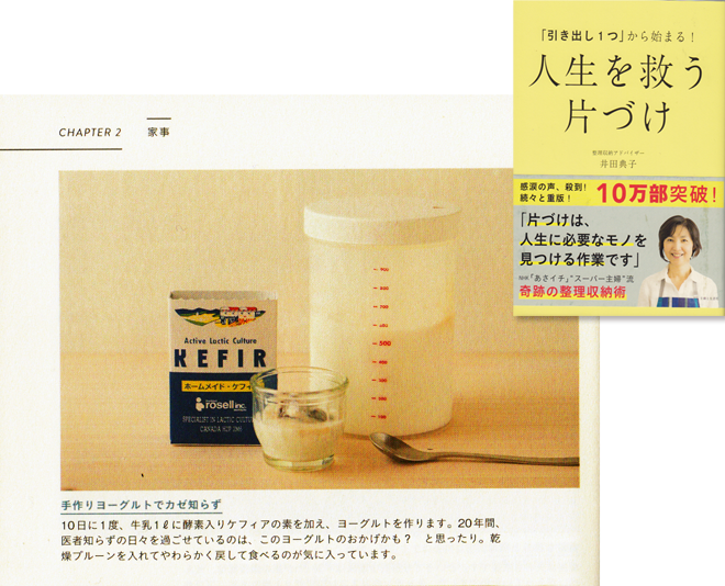 井田典子先生の著書「人生を救う片づけ」にホームメイド・ケフィアが紹介されています。「20年間、医者知らずの日々を過ごせているのはこのヨーグルトのおかげかも?と思ったり」と最大の賛辞を贈っていただきました。