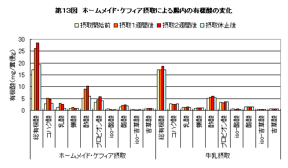 | また、第13図からホームメイド・ケフィアの摂取は、腸内の硫化物生成を抑制していることがよくわかります。 |
