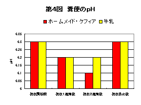 | 第3図でもホームメイド・ケフィアの摂取によって腸内の総有機酸が明らかに増加していましたし、第4図に示した腸内のpHもホームメイド・ケフィアの摂取によって明らかに低下しています。 |