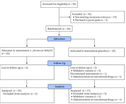 | 40 人の被験者が、L. plantarum HAC01 (n = 20) またはプラセボ (n = 20) のいずれかを投与される 2 つのグループに無作為に割り当てられました。 無作為化後、同意の撤回(n = 2)および禁止薬物の投与(n = 1)により、3 人の被験者が分析セットから除外されました。 したがって、プロトコルごとのセットには、最終的に合計 37 人の被験者が含まれることになりました (図 1)。 ベースライン特性は 2 つのグループ間で類似していました (表 1 に示すように)。 |