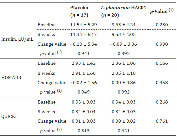 | 表 2、表 3、図 2 は、空腹時血漿グルコース(FPG)、食後2時間の血漿グルコース(2h-PPG)、iAUC0-2h、HbA1c、空腹時インスリン、HOMA-IR、QUICKI などのグルコース代謝に関連するパラメーターの変化を示しています。 プラセボ群と比較して、L. plantarum HAC01を投与した群では8週間後に2h-PPGおよびHbA1cレベルの有意な低下が観察された(表1および図2)。 FPG、空腹時インスリン、HOMA-IR、およびQUICKIにおいて、L. plantarum HAC01群とプラセボ群との間に有意差はなかった(表2および表3)。 |