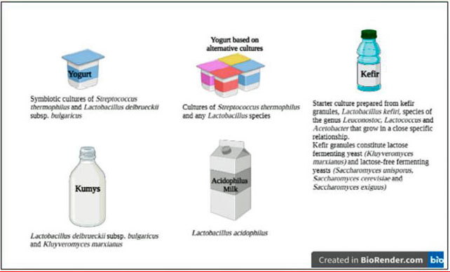| 発酵乳製品では、Lactobacillus, Lactococcus, Leuconostoc, Pediococcus, Bacillus,Propionibacterium およびBifidobacterium属に属する細菌が主に顕著です[30]。Lactobacillus属は、314種の最大の属であり、過去20年間でプロバイオティクスと最も関連性の高いキーワードになっています。しかし、プロバイオティクスとしていくつかの乳酸菌属を受け入れることについて、科学者の間でコンセンサスはありません[31]。文献で最も研究されているプロバイオティクス乳酸菌のいくつかは、 Lactocaseibacillus rhamnosus GG (ATCC53103), Lactocaseibacillus rhamnosus HN001, Lacticaseibacillus casei Shirota,Lacticaseibacillus casei Zhang, Lactobacillus acidophilus NCFM, Lactobacillus acidophilus LA-5 および Lacticaseibacillus casei DN-114 001です。最近、Limosilactobacillus reuteri およびLactobacillusjohnsoniiなどの新しいプロバイオティクス乳酸菌が、機能性乳製品の開発に使用されています[25,32]。ミルクおよび乳製品のコーデックス委員会の定義によると、ヨーグルトおよびその他の発酵乳製品の特定のスターターカルチャーを図1に示します[33]。プロバイオティクスの有益な効果は菌株特異的であるため、同じ種の異なる菌株は宿主に完全に異なる効果を引き起こす可能性があります。したがって、新しい乳酸菌株のプロバイオティクスの可能性と、乳製品のよく知られたスターターカルチャーを理解するには、さらに多くの研究が必要であると述べられています[34]。 |