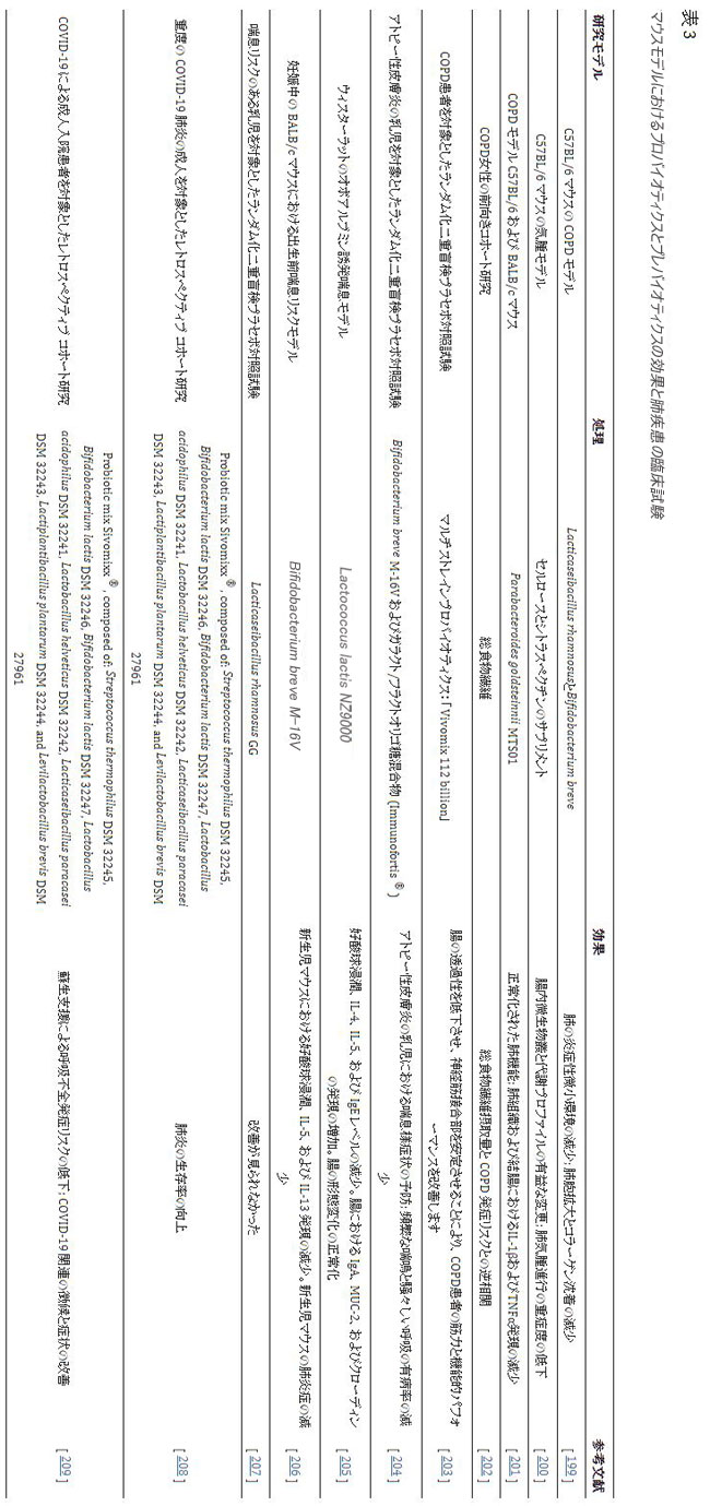 | 一方、Koning et alは、ヒトを対象とした無作為化二重盲検試験で、抗生物質治療中および治療後の多株プロバイオティクスの摂取が慢性閉塞性肺疾患患者の腸内細菌叢 を変化させるかどうかを調査しました。 しかし、腸内細菌叢組成に違いは見られなかった[218]。 |