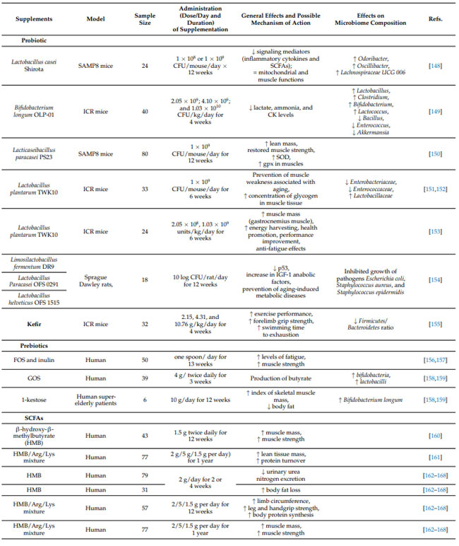 | Chanらは、腸-筋肉軸を介した加齢に伴う筋肉障害の発症と進行に対するプロバイオティクスの効果の証拠を提供している[236]。 |