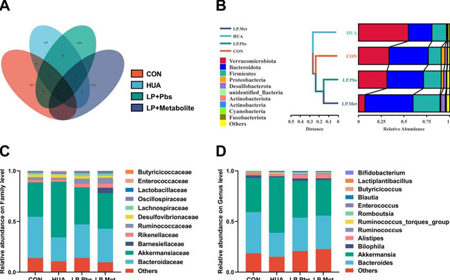 図8—図補足1。L. plantarum SQ001およびL. plantarum SQ001とその代謝物のガチョウの腸内細菌叢への影響。 (A) 示されたグループのガチョウの糞便サンプルにおける細菌操作分類単位 (OTU) のベン図。示されたグループのガチョウの門 (B)、科 (C)、属 (D) レベルでの腸内細菌の相対的豊富さ。 |