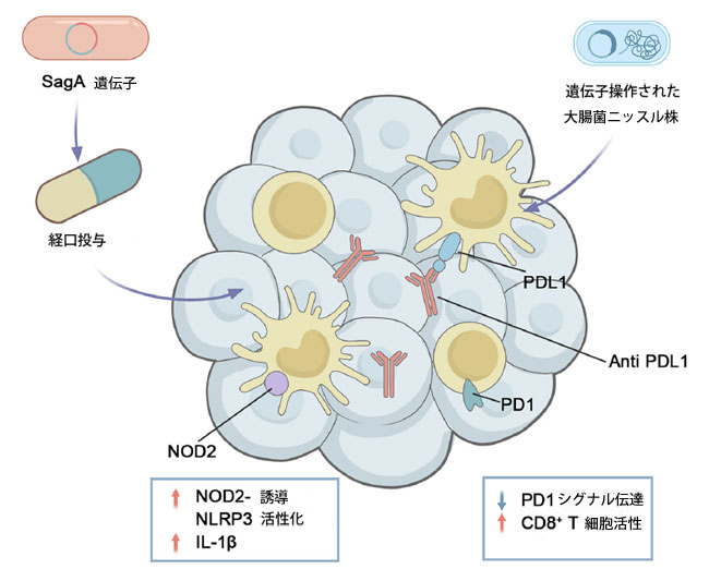 SagAを発現する経口投与されたラクトバチルス・プランタルムは、マクロファージNOD2と結合するムロペプチドを生成し、NLRP3インフラマソームを活性化してIL-1βを放出する。同時に、腫瘍に定着する大腸菌Nissleは、その場で抗PD-L1ナノボディを分泌し、PD-1/PD-L1相互作用を阻害してCD8⁺ T細胞活性を回復させる。 略語:NOD2(ヌクレオチド結合オリゴマー化ドメイン含有タンパク質2)、SagA(分泌抗原A)。 |