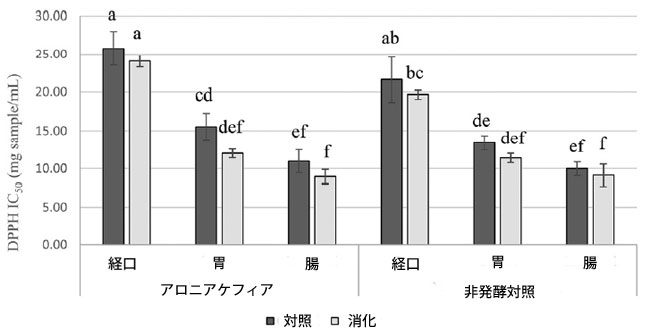 図 2 消化中のアロニア ケフィアと非発酵コントロールの抗酸化能、 データは平均 ± 標準偏差として表示 (n = 3)、同じ文字のバーは p < 0.05 で有意差なし。 |
