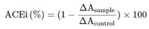 | L. plantarum K25で作られたプロバイオティクス発酵乳サンプルを遠心分離(10,000 ×g、20分、4°C)して、ペプチド画分を含む上清を得た[25]。上清のpHを7.2に調整し、上清をリン酸緩衝生理食塩水(pH = 7.2)で100倍に希釈した後、Ronca-Testoni(1983)が報告したように、トリペプチド、2-フラナクリロイルフェニルアラニルグリシルグリシン(FAPGG)を基質として使用し、いくつかの修正を加えて分光光度計で上清のアンジオテンシン変換酵素阻害活性を測定した[26]。簡単に説明すると、100 μl の FAPGG 溶液 (100 mmol/l Tris HCl、0.6 mol/l NaCl、pH 7.2 を含む反応バッファー中 1.66 mmol/l) を、96 ウェルマイクロプレート内で、同じ反応バッファー 85 μl またはサンプル 85 μL と直接混合しました。溶液を 37°C で 3 分間保持した後、15 μL の アンジオテンシン変換酵素溶液を加えました。反応は 345 nm で 10 分間モニタリングしました。アンジオテンシン変換酵素阻害活性は阻害率 (ACEi%) として計算しました。ACEi 活性は次のように計算しました。 |