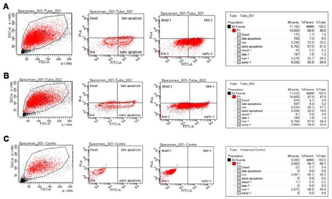 | 図5 ヒト大腸腫瘍 HCT 115細胞に対する L. plantarum、L rhamnosus、および L. acidophilus の Annexin V/PI 分析、(A) L. plantarum 処理、パネル (B) L. rhamnosus 処理、パネル (C) L. acidophilus 処理 (コントロール)。 |