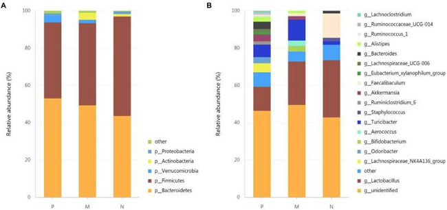 | H9N2 に感染したマウスの腸内微生物組成に対する L. plantarum 0111 の影響を調べるために、細菌を門 (図 4A) および属 (図 4B) レベルで分析し、微生物分類分布の動態を特徴付けました。門レベルでは、Proteobacteria, Actinobacteria, Verrucomicrobia, Firmicytes, および Bacteroidetes が腸内微生物群集で優勢です。Proteobacteria, Actinobacteria, Firmicytes, と Bacteroidetesは、グループ N でそれぞれ 1.44、1.29、53.31、43.62% を占めました。同時に、P群ではActinobacteriは出現せず、ActinobacteriとBacteroidetesはそれぞれ3.672%と53.02%に増加しました。Firmicytesの割合は40.717%に減少しました。M群ではActinobacteria, Verrucomicrobia, とBacteroidetes はそれぞれ3.73%、1.75%、49.32%で増加せず、Firmicytesは44.08%に減少しました。 |