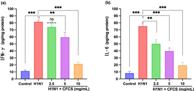 | 図5 H1N1 ウイルスに感染した哺乳類の腎臓細胞における無細胞培養上清処理によるインターロイキン レベルへの影響。(a) IFN-γ および (b) IL-6。実験は 3 回実施し、結果を平均 ± SE 値として示しています。統計的有意性は、コントロール グループおよび処理グループのサイトカイン レベルを H1N1 のみに感染したグループと比較することによって評価しました。p 値: ** < 0.01、*** < 0.001、ns = 有意でない。 Control:リン酸緩衝生理食塩水、H1N1: インフルエンザ A ウイルス、CFCS: 無細胞培養上清。 |