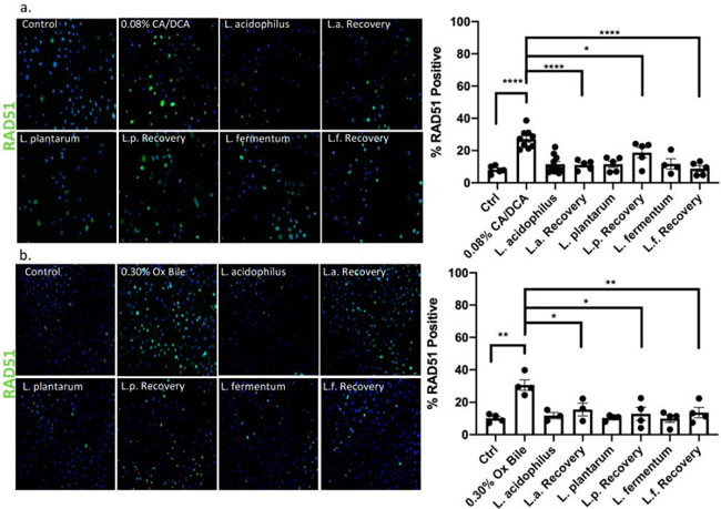 図8 乳酸菌は、RAD51 の核局在化と相同修復機能の補助を発揮します。 (a) コール酸塩/デオキシコール酸塩または (b) 牛胆汁に 30 秒曝露した 30 分後の RAD51 特異的抗体および Alexa488 結合二次抗体 (緑色) による免疫蛍光では、陽性食道上皮細胞の増加が示されています。 回復時間中に乳酸菌と共培養された上皮細胞は、未処理のコントロールと同様の RAD51 陽性シグナルを示します。 * p < 0.05、** p < 0.01、**** p < 0.0001。 |