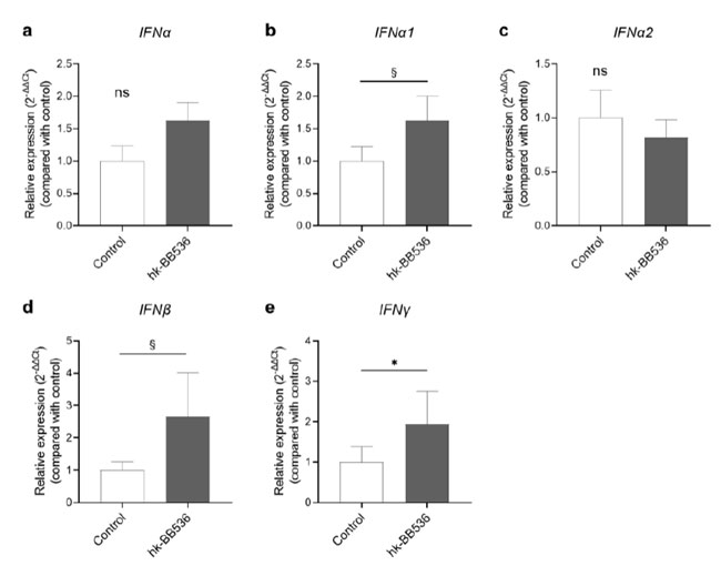 図 2 qRT-PCR 分析による末梢血単核球の遺伝子発現レベルに対する 加熱殺菌(hk-)B.longum BB536の効果。 (a) IFNα; (b) IFNα1; (c) IFNα2; (d) IFNβ。 (e) IFNγ。 すべてのデータは平均値 ± SE (n = 8) として表されます。 *、p < 0.05 および §、0.5 ≤ p < 0.1 対対照。 ns: 有意差なし。 |