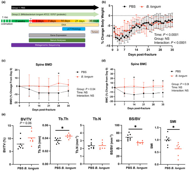 図 1 Bifidobacterium longum の補給は、外傷後の体重減少と腰椎内の骨量減少を軽減します。 PBS: リン酸緩衝生理食塩水 (a) 18 か月齢の雌マウスをランダムに割り当て、2 週間 PBS (リン酸緩衝生理食塩水コントロール) または B. longum (プロバイオティクス) を投与した後、大腿骨骨折を作製し、治癒と全身効果を評価する研究デザイン。 (b) Bifidobacterium longum の補給は、骨折後早期の体重減少を鈍化させました。データは、骨折前 (0 日目) の体重からのパーセンテージ変化として表されます。2 元配置分散分析に続いて Sidak の多重比較検定を実施、* PBS と比較して p < 0.05 (n = 10/グループ)。 B. longum腰椎 (L1–L5) の変化 (c) 骨密度 (BMD)、および (d) 骨ミネラル含有量 (BMC)。データは骨折前(0日目)の値からの変化率として表されます。二元配置分散分析に続いてSidakの多重比較検定を実施、*PBSと比較してp < 0.05(n = 10/グループ)。 (e)Bifidobacterium longum の補給により、骨折後35日目のL3椎体内の海綿骨の骨梁厚さ(Tb.Th)、骨表面密度(BS/BV)が増加し、構造モデル指数(SMI)が減少しました。スチューデントt検定、*p < 0.05(n = 7-8/グループ)。各データポイントは独立した観察を表します。 |