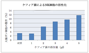 ケフィア菌によって活性化したヒトNK細胞(ナチュラルキラー細胞)が、ヒト大腸ガン細胞を攻撃し細胞が破壊されたときに細胞外に出てくる酵素の量を測定し、ガン細胞の傷害率でNK活性を示します。図をみるとケフィア菌の量が増えるにしたがって、ガン細胞の傷害率が高くなります。
