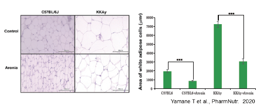 その内臓脂肪を構成している脂肪細胞を顕微鏡で観察してみるとアロニア果汁を飲んだマウスでは、下図のように脂肪細胞の大きさが縮小していることが判明しました[2]。