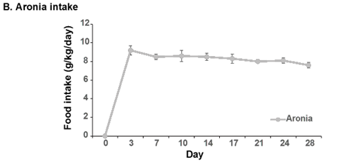 図2. SHRを投与した対照とアロニアベリーの食物摂取量の違い A.食物摂取量は28日間測定され、結果は対照群とアロニア群の間に有意差を示しませんでした。 n = 5。 |