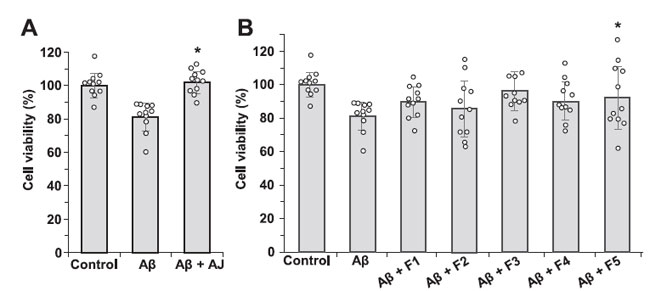 | 図 5. アミロイドβ25-35 ペプチドによって誘導される神経芽腫細胞(SH-SY5Y)の 細胞死に対するアロニアジュース (A) およびその画分 (B) の効果。 n = 11。⁎p < 0.05。 (A) 細胞を、2.5 mg/mL アロニアジュース(AJ) の非存在下 (Aβ) および存在下 (Aβ + AJ) で アミロイドβ25-35 ペプチド (25 μM) とインキュベートしました。 (B) 細胞を各画分 (2.5 μg/mL) の存在下で アミロイドβ25-35 ペプチド (25 μM) とともにインキュベートしました。 |