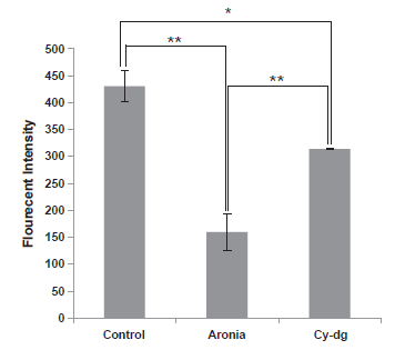 | これらの結果は、アロニアジュースに他のDPP IV阻害剤が存在することを示しています。アロニアジュースには少なくともシアニジン3-O-グルコシド、シアニジン3-O-ガラクトシド、シアニジン3-O-アラビノシドが含まれていたため、これらのアントシアニンはシアニジン3,5-ジグルコシドでDPP IV活性を阻害しました。 |