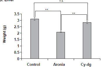 | 水、シアニジン-3,5-ジグルコシドまたはアロニアジュースをマウスに経口投与した。49日後、精巣上体の白色脂肪組織(A)と肝臓を採取し、体重を測定しました。 * p <0.05、n.s .:重要ではない。 n = 5。 |
